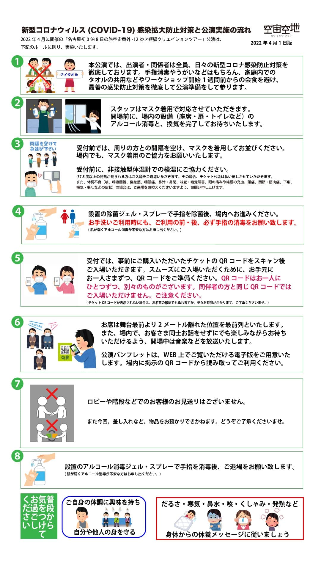 以下は、「名古屋発0泊8日の旅空宙番外地-12ゆき短編クリエイションツアー」に際しての具体的対策の情報です。