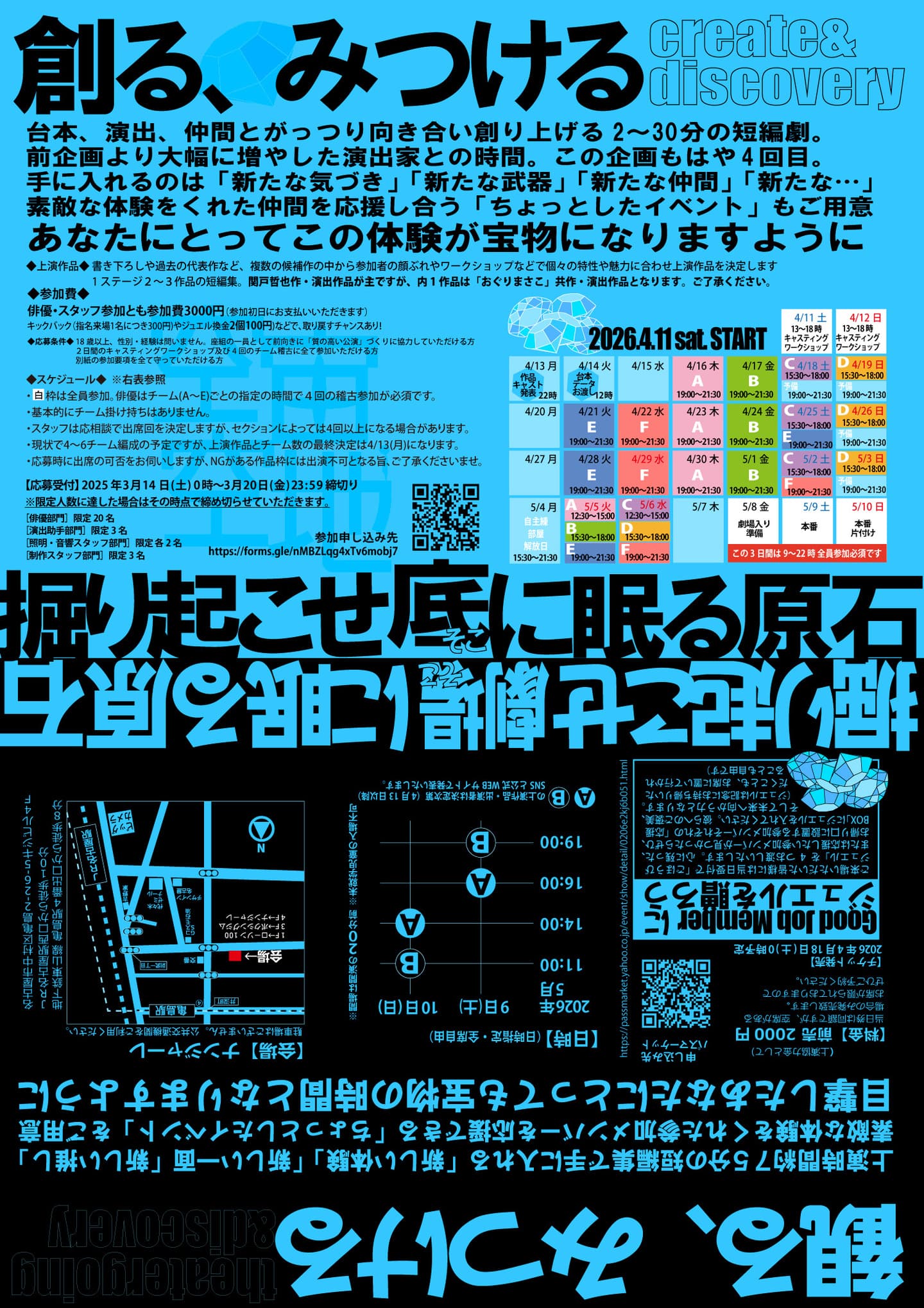 台本、演出、仲間とがっつり向き合い創り上げる2~30分の短編劇。 前企画のクリエイションツアーより大幅に増やした演出家との時間。 手に入れるのは「新たな気づき」「新たな武器」「新たな仲間」「新たな…」 素敵な体験をくれた仲間を応援し合う「ちょっとしたイベント」もご用意 あなたにとってこの体験が宝物になりますように。