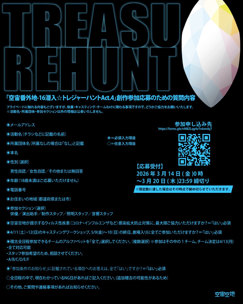 18歳以上。性別・経験は問いません。座組の一員として前向きに「質の高い公演」づくりに協力していただくこと