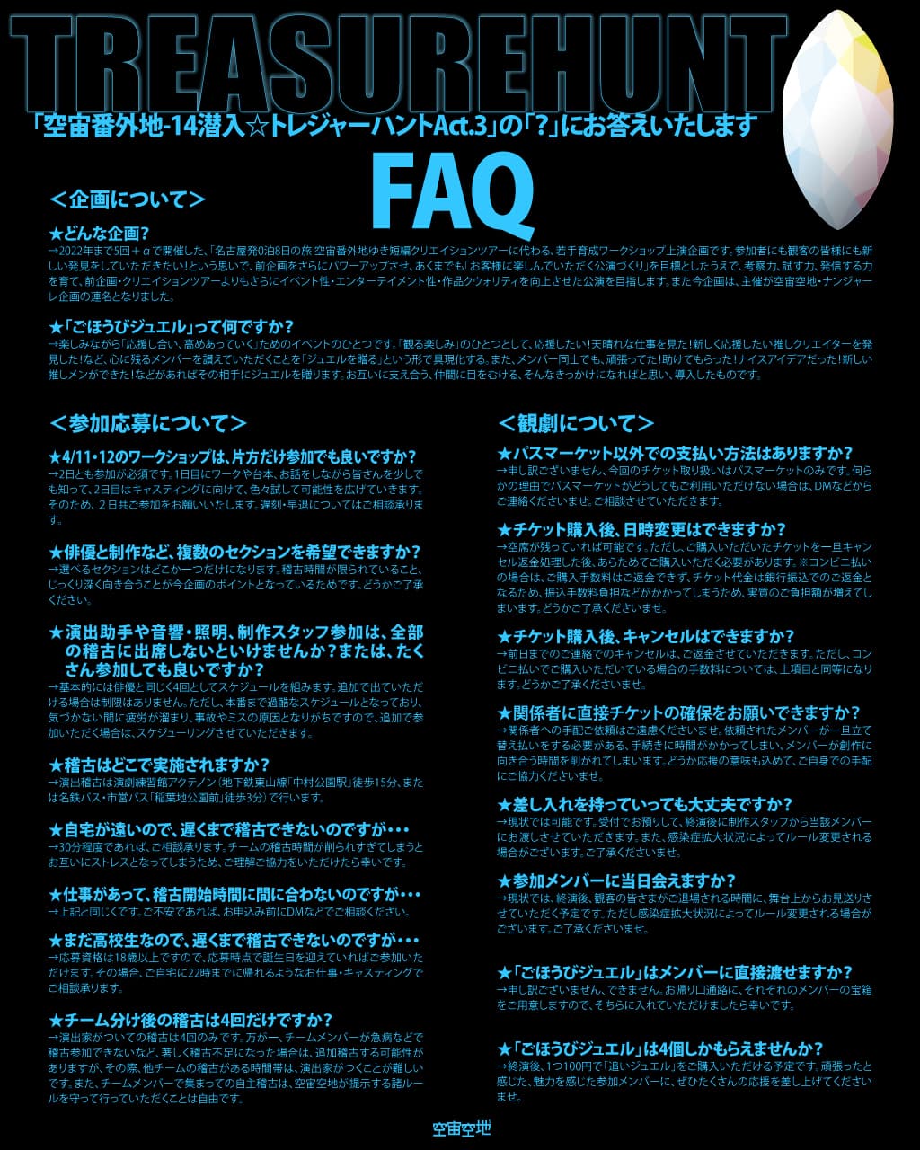 ご来場いただいた皆様には当日受付で「ごほうびジュエル」を4つお渡しいたします。心に残った、または応援したい参加メンバーが見つかったらぜひ、お帰り口に設置する参加メンバーそれぞれの「応援BOX」にジュエルを入れてください。彼らへのご褒美、そして未来へ向かう力となります。(ジュエルは記念にお持ち帰りいただくことも、お席に置いて行かれることも自由です)