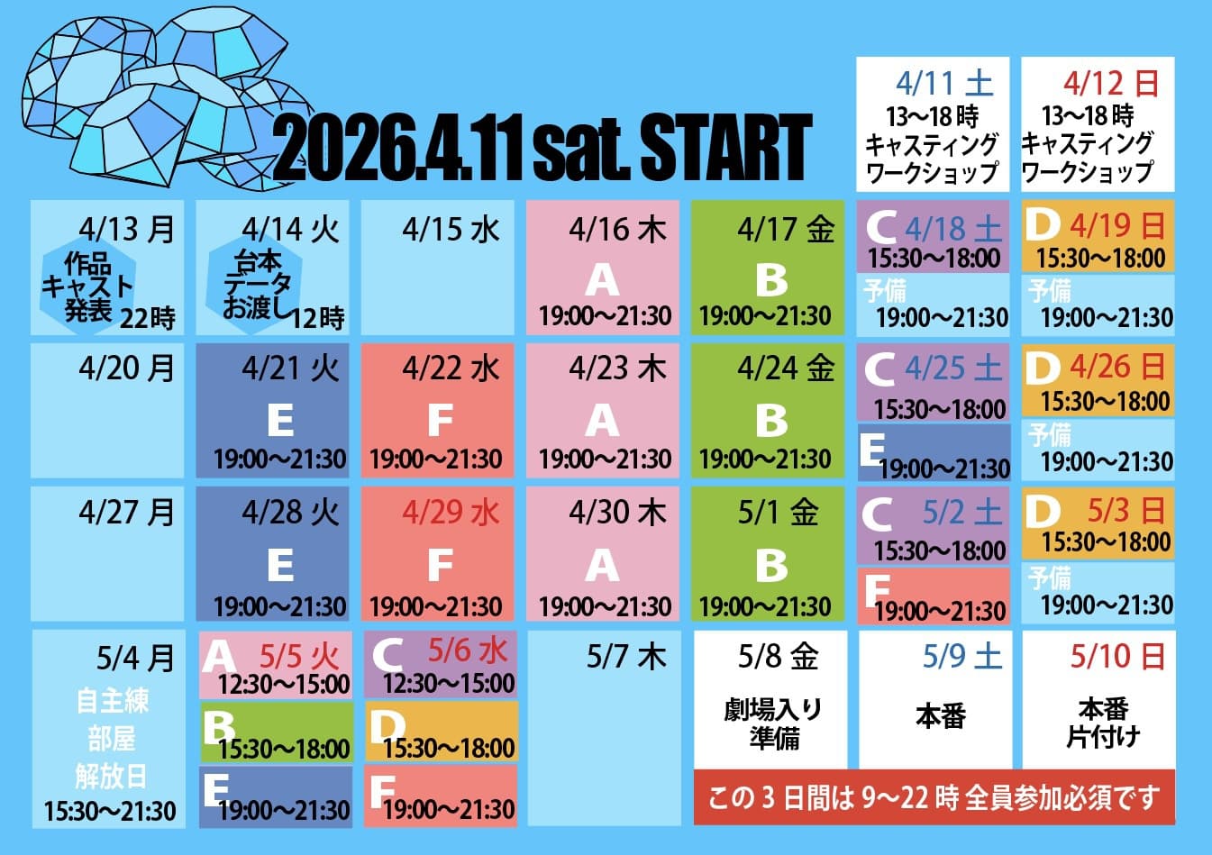 ・白枠は全員参加。俳優はチーム色ごとの指定の時間で4回の稽古参加が必須です。 ・基本的にチーム掛け持ちはありません。